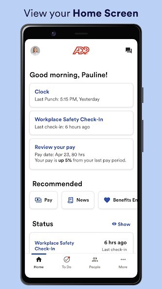 ADP Mobile Solutions provides you with an easy and convenient way to access payroll, time & attendance, benefits, and other vital HR information for you and your team.- All the features listed below may not be available to you.