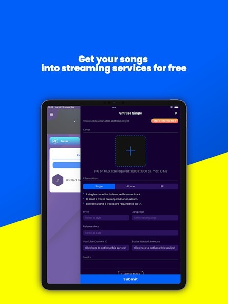 Dibsteur is a free music distribution application that allows you to collect up to 100% of your royalties and to benefit from a large number of additional services to accelerate the development of your artistic career.We are the first French application that makes it possible to distribute your music on the largest distribution platforms.