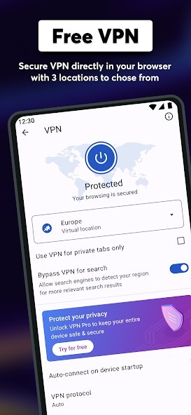 Improve your privacy and security on public networks with our built-in browser VPN. The unlimited VPN lets you avoid sharing your location and identity, staying anonymous and safe online. You can also switch to different virtual locations if needed for extra browser security.